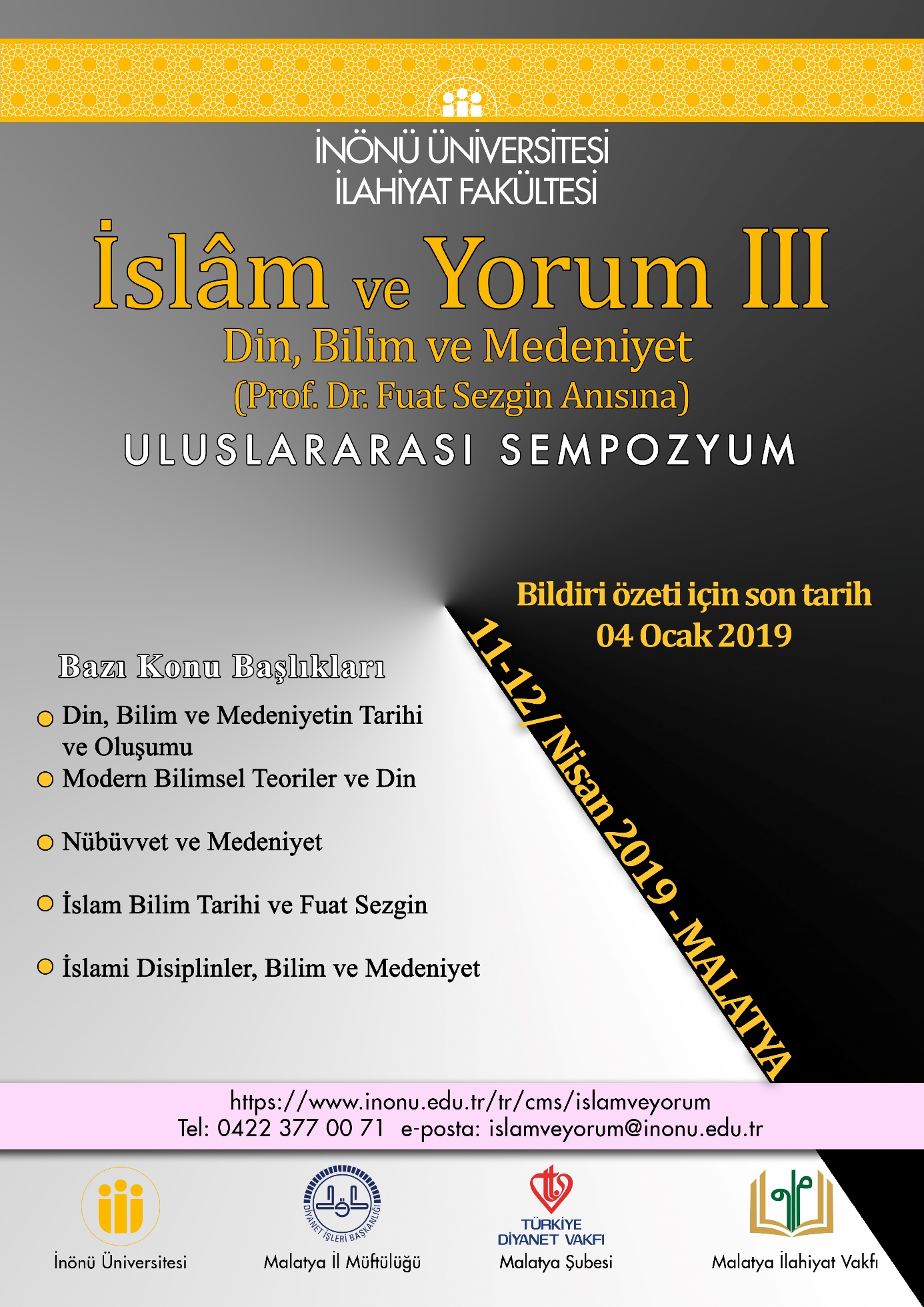 İnönü Üniversitesinin ev sahipliğinde İlahiyat Fakültesince her yıl “Doçentlik ve Akademik Teşvik yönetmelik” hükümlerine uygun olarak düzenlenen ve bu yıl üçüncüsünün yapılacağı, Uluslararası İslam ve Yorum sempozyumunun ana teması, “Din, Bilim ve Medeniyettir.” Bu program; İslam bilim ve medeniyet tarihi üzerinde çalışmalar yapan ve dünya ölçeğinde büyük bir iz bırakan merhum Prof. Dr. Fuat Sezgin anısına düzenlenmiştir.Böylece ömrünü ilme adayan merhuma karşı, bir vefa borcu yerine getirmek istenmiştir.