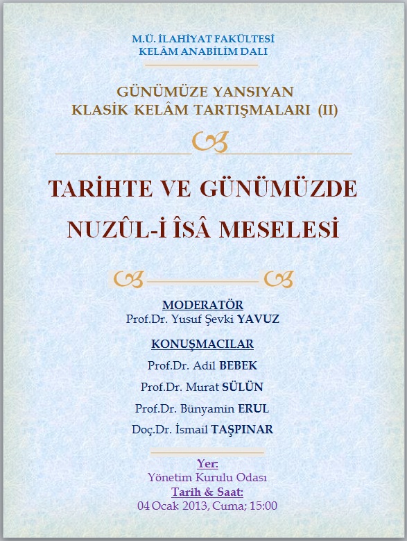 "Tarihte ve Günümüzde Nuzûl-i İsâ Meselesi" başlıklı Günümüze Yansıyan Klasik Kelâm Tartışmalarının ikincisi, Marmara İlahiyatta 04.01.2013 Cuma günü düzenleniyor, fırsat bulan herkes davetlidir. Afiş için tıklayınız!